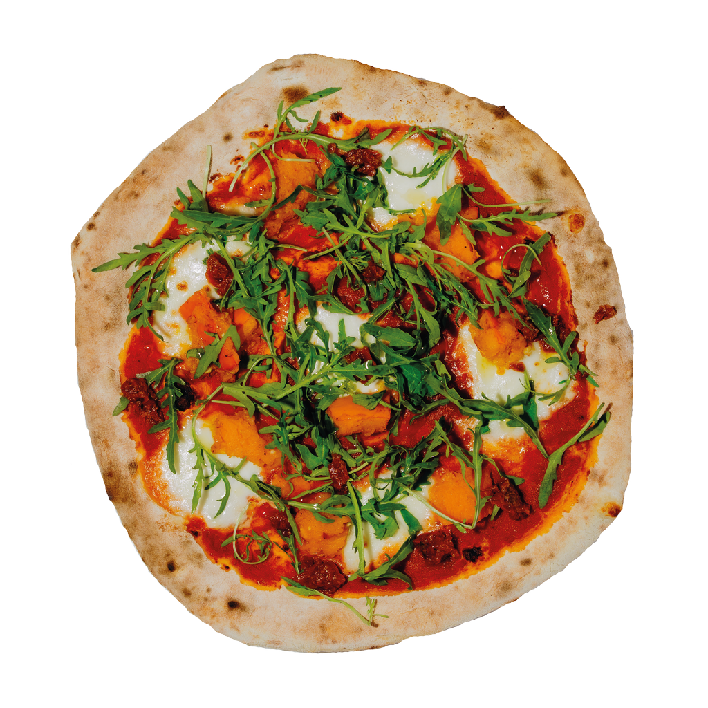 Tomato sauce, mozzarella, pumpkin, olive oil, black pepper, arugula, secret topping