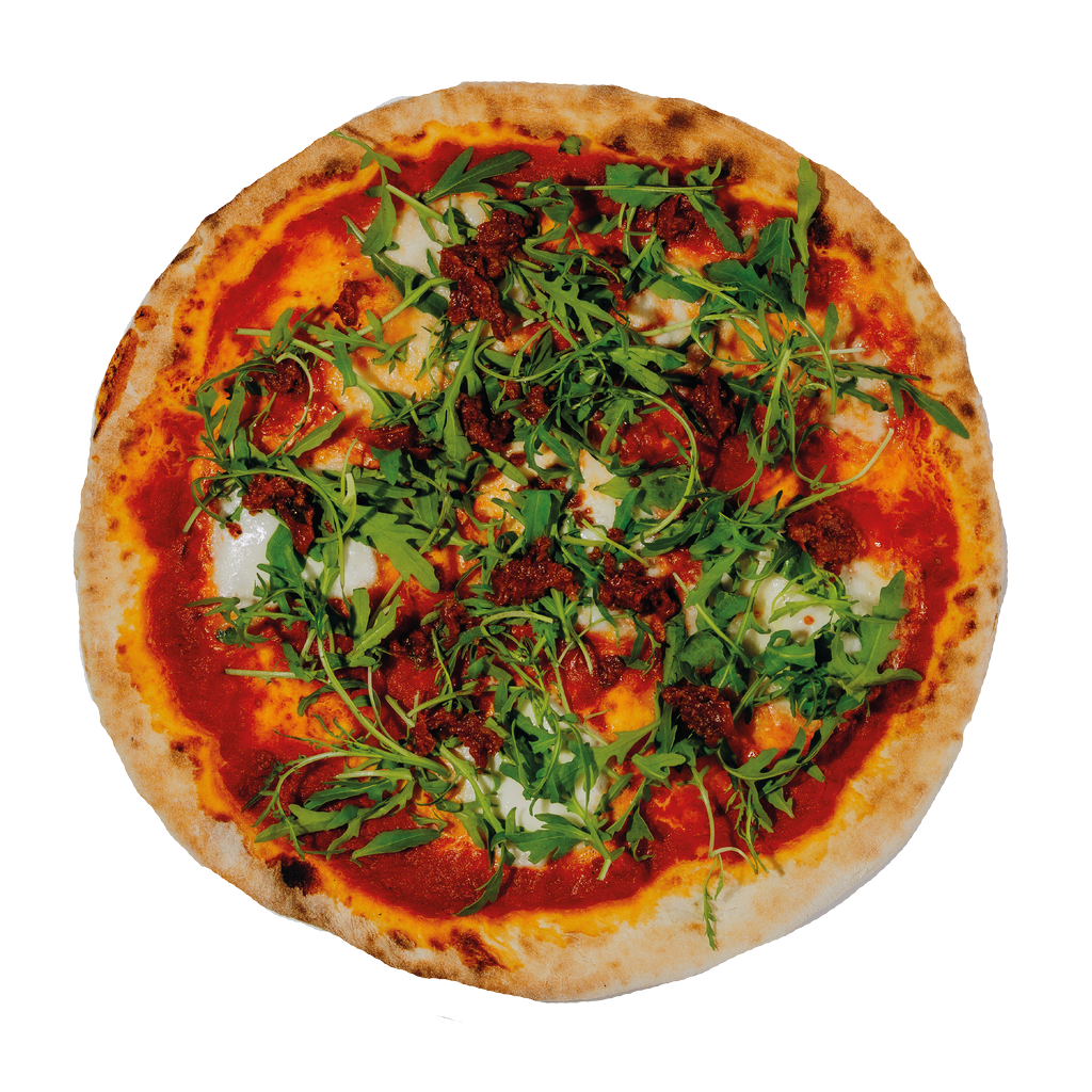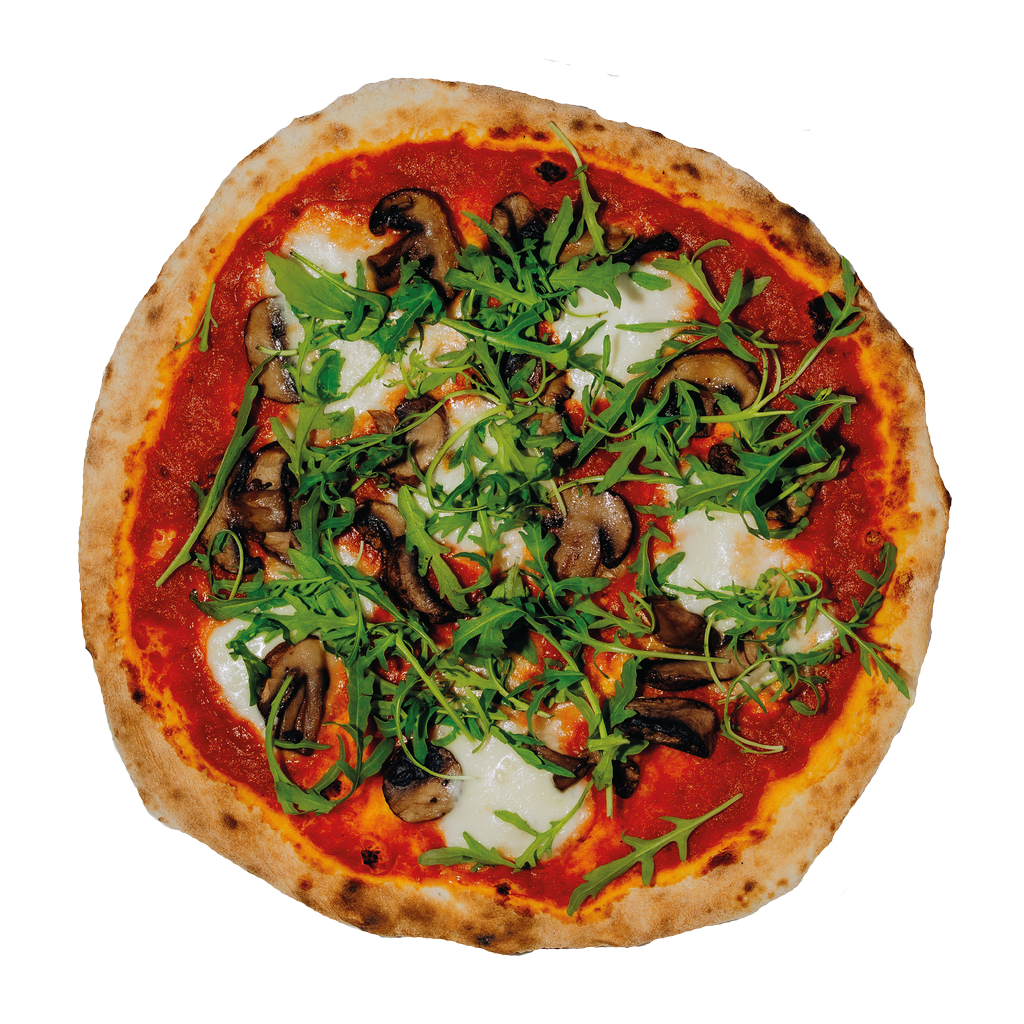 Tomato sauce, mozzarella, mushrooms, olive oil, black pepper, arugula, secret topping