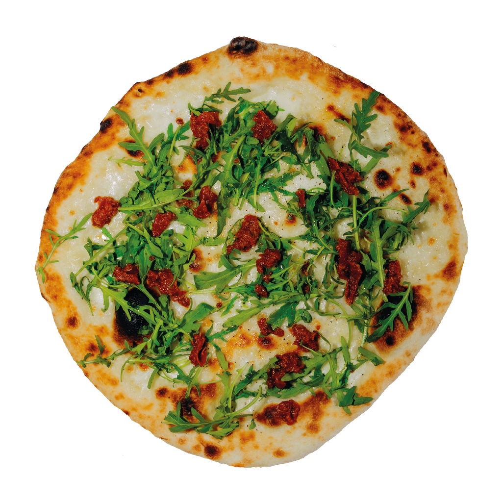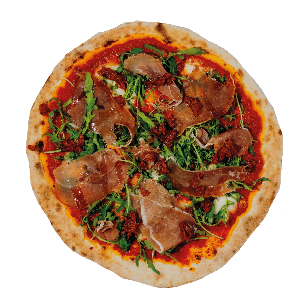 Dough, Sauce, Mozzarella, Secret topping, Arugula, Chopped Prosciutto, Olive, Black pepper