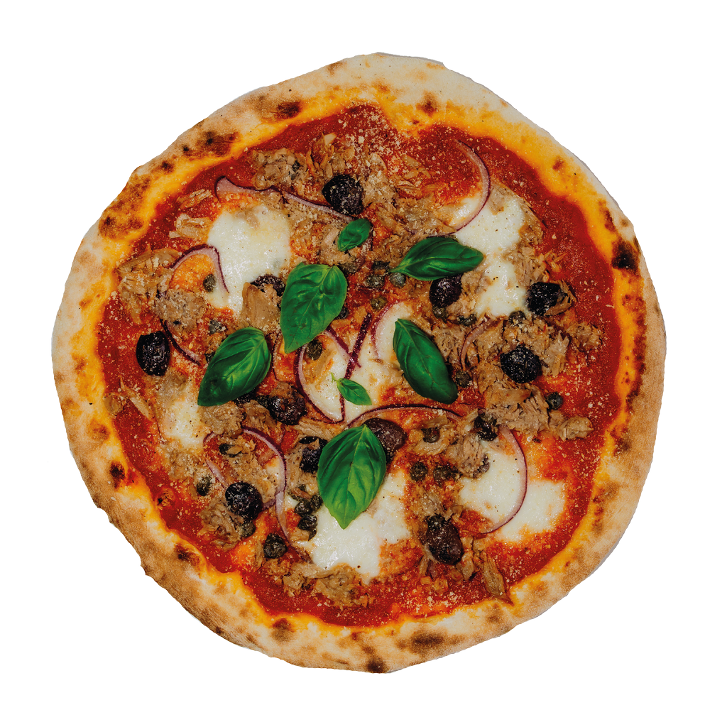 Dough, Sauce, Mozzarella, Tuna, Olives/capers, Red onion, Basil, Garlic crumble